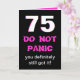 This funny milestone 75th birthday card is perfect for women. A large white 75 has some hot pink edges on a black background. "DO NOT PANIC" appears in hot pink right below and "you definitely still got it." All the funny appears inside. Note: This card should only be given to women who have a good sense of humor about getting older. Copyright Kathy Henis