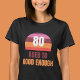 This fun 80th birthday t-shirt features a big "80" in the center of a colorful sunset as the focal point. Below are the words, "AGED TO GOOD ENOUGH." This design appears on a black t-shirt but you can select other colors. This is a funny shirt that she will love wearing because of all the fun colors. Copyright Kathy Henis