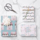 These wrapping papers feature fun designs and quotes for Christmas. The first sheet includes a festive fireplace with stockings, pink bottlebrush trees, and disco balls. The second reads “getting lit” and the third reads “better not pout”.