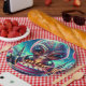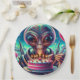 Alien themed birthday party paper plates. An extraterrestrial eating cake with a birthday hat on.
