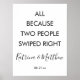 Funny All Because Two People Swiped Right custom, personalized elegant, simple, minimalist, modern calligraphy script black and white template wedding sign.