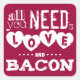 The design reads 'All YOu Need Is Love and Bacon' in a variety of fun beautiful fonts, making a funny humorous design for anyone who loves bacon.