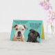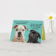 These two dogs (an American Bulldog and a Black Pug) are discussing why all the humans are wearing muzzles (aka: masks). Their answer? Must be because humans haven't learned the sit and stay commands yet. Funny and cute card to bring a smile to everyone who's been wearing the mask and sheltering in place during this pandemic. All texts are customizable.