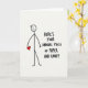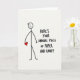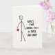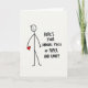 This funny card shows a simple stick figure drawn in thick black lines on an off-white background. The figure has a round head with a small, easy smile and a relaxed stance. One arm holds a small red heart close to its body, standing out as the main pop of color ❤️. To the right, the card features the message “HERE’S YOUR ANNUAL PIECE OF PAPER AND CANDY” in large, hand-lettered black writing that looks like casual marker. The text takes up a big section of the right side and feels direct, a little dry, and funny in a sweet way 💌. With the plain setting and the single red heart, the design keeps the focus on simple affection and a light joke about Valentine’s Day traditions 🍫.