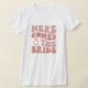 Cute and Funny Bachelorette T Shirt for the bride to be. Simple text that says Here comes the bride with pink lettering and a pink ring.