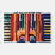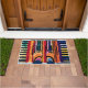 A colorful, cartoon-style doormat with a barcode pattern. Two bare feet are shown standing on the mat, as if being scanned before entering.