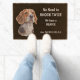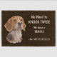"No need to knock twice, We have a Beagle" declares this cute door mat. The text is in pale cream at the right side, while an adorable picture of a brown, black and white beagle is at the left. Everything is placed on a gray brown background.