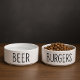 This minimalist dog bowl for water features the word "beer" in a trendy black text on a clean white ceramic base. Designed for modern dog lovers, it blends style and humor in a sleek, functional piece. Perfect for dogs with a foodie attitude and pet parents who love trending, understated accessories. A matching food bowl with "burgers" text is available separately to complete the look.
