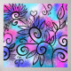 A funny little bird in the upper left corner and floral elements on a pink, purple and turquoise background.