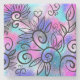 A funny little bird in the upper left corner and floral elements on a pink, purple and turquoise background.