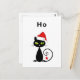 Shows a black cat with green eyes and curly tail. The cat wears a red Santa Claus hat and has a Christmas star ornament hanging from its tail. The text above reads "Ho," which is an unenthusiastic "ho ho ho." Customize and personalize the back text, which reads "Man, it's been tough. Wishing you a post-pandemic Merry Christmas."
