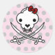 Get this cute classic round sticker with this cute and scary cartoon of a Jolly Kitty Pirate Skull and Bones. The background is pale pink with a gray polka dot.