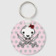 Secure your keys on this funny key chain with this cute and scary cartoon of a Jolly Kitty Pirate Skull and Bones. The background color is pink.