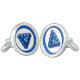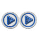 Gift your friend these silver plated Pair of Cuff-links with this cool impossible triangle construction. The background white with a black and blue border.