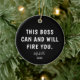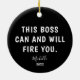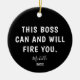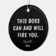 Show your boss some humor with this Funny Boss Personalized Year Christmas Ceramic Ornament. It is designed on both sides with a funny saying, "this boss can and will fire you" in bold white lettering on black background followed by name in trendy hand lettered script and custom year. Perfect boss gift idea for any occasion.