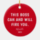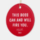 Show your boss some humor with this Funny Boss Red Personalized Year Christmas Ceramic Ornament. It is designed on both sides with a funny saying, "this boss can and will fire you" in bold white lettering on dark red background followed by name in trendy hand lettered script and custom year. Perfect boss gift idea for any occasion.