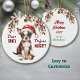 On the front of this Holiday ornament is the image of a cute Boston Terrier puppy wearing a red and white Santa Claus hat and a red bow. He sits with a broken tree ornament in front of him. The red text says "Dear SANTA Define NAUGHTY". On the back, red and green text says MERRY CHRISTMAS", and there are additional text fields for you to customize to whatever you'd like.