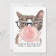 Whimsical watercolor illustration features cat wearing funky retro style glasses blowing bubble gum. Customizable "Happy Birthday" text