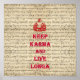 Funny humorous take on the popular "keep calm" slogan with a Buddhist theme. "Keep Karma and Live Longa" red text on an antique vintage Buddha book illustration on a vintage paper background.