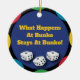 Colorful and fun Bunko ornament for your favorite Bunco player. What Happens At Bunko Stays At Bunko funny motto. Includes three lucky Bunko dice on this color design.