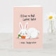 This card shows a plump white rabbit lounging on its belly against a soft pastel pink background, giving the scene a cozy, affectionate mood 🌷. The rabbit’s long ears frame its face, with pale pink inner fur, closed eyes, and rosy cheeks that suggest a bashful grin, like it’s sharing a private joke with someone close. Nestled in its front paws is an orange carrot with leafy green tops, adding a bright contrast that feels like a sweet offering 🐰. Near the top, casual hand-lettered text in a dark tone reads “i’ll hop on that carrot later,” setting up a flirty, teasing beat. Below the rabbit, a smaller line of matching text says “i mean, happy easter,” like a quick, sheepish correction after getting carried away. The spacing keeps the rabbit centered as the main focus, with the top line arcing lightly above and the second line sitting comfortably underneath. Gentle shading beneath the rabbit gives it a soft grounded look on the pink field. The carrot’s green leaves fan upward in three small tufts above the orange body.