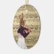 Funny bunny rabbit character in a dress wearing a dress playing a violin on a vintage music sheet background.