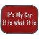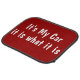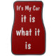 Funny novelty automotive car mats in a bold red and white statement about the shape of your car that says who cares while you protect your car floors in a fun way. Designed for guys or girls the front and rear driver and passenger sides.