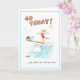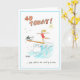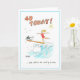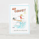 Greeting card for 40th birthday - funny cartoon of woman surfing on the crest of a wave with cute spaniel dog.