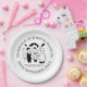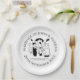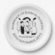 Paper plates for a wedding party or outdoor reception. Funny wedding cartoon at the centre and wording that includes the names of the bride and bridegroom as well as the date of the wedding.