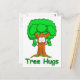 Ideal for tree lovers. Cute funny cartoon tree with green leaves, a brown trunk, a happy smile and big round eyes. Under the tree are the words "Tree Hugs" in green text.