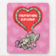 A funny tabby cat on a mouse mat or mouse pad. Use "Personalize this template" to add your own text and create a unique, customized item. Declare your passion for something or someone with a rabid, drooling cat, clinging to it's favorite, knitted, catnip mouse toy as if it's life depended upon it. Featuring a gray, stripey cat with green eyes and a manic, obsessed expression, holding a striped, brightly colored catnip mouse toy.
