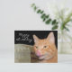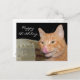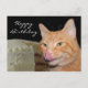 Orange tabby cat licks his chops at a birthday cake photo birthday postcard
