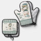 Cute oven mitt and pot holder set featuring an illustration of a funny kitty preparing fish. Great for a anyone loving seafood, cats or the beach.