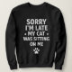 Stay cozy and unapologetically late with the ultimate cat lover's hoodie! This "Sorry I'm Late, My Cat Was Sitting On Me" black sweatshirt features a charming white text design and a cute paw print, perfectly capturing the struggle of every pet parent. Made with soft, warm fabric, it's the ideal choice for those chilly mornings when your cat decides your lap is the best nap spot. Whether you're lounging at home, running errands, or heading to a casual hangout, this hoodie is a hilarious way to show off your feline-first priorities. A purr-fect gift for cat moms, sisters, or any friend who is officially "owned" by their cat