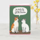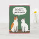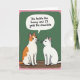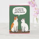 This card shows two domestic cats sitting close together on a rustic wooden surface, their bodies angled as if they’re in on the same little secret. Behind them is a deep emerald-green background framed by a rose-pink border, giving the scene a sweet, cozy stage. The cat on the left has ginger-and-white fur, wide black eyes, and a small, knowing smile that reads like friendly confidence. Beside it, an all-white cat tilts its face upward with an eager look, as if checking that its partner is listening. Between their heads, a rounded thought bubble floats with black text that says, “You tackle the bunny and I’ll grab the chocolate,” adding a cheeky Easter twist 🐰. The closeness of their poses and the way their eyes line up toward the bubble makes their teamwork feel affectionate, like best friends sharing a private plan. The colors stay flat and simple, with crisp outlines that keep the focus on their expressions and the joke. The thought bubble sits centered above them, while the pink frame runs evenly around the green field like a neat border 🌷.