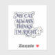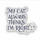 Show off your cat-approved confidence with this fun, quirky sticker. Featuring the phrase “My Cat Always Thinks I’m Right”, it’s perfect for cat lovers who know who’s really in charge at home. Stick it on your laptop, water bottle, planner, or anywhere that could use a touch of feline humor.
