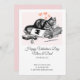 Cute cat Valentine for mom and dad featuring a cat lying on books, short funny text reads: Thanks for always letting me get all over your stuff. PS: My paw writing is not so good. If you look closely you will see that the open page of the book says "m" is for mouse". A little light cat reading!