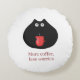 Throw Pillow with cute and funny print with cat and coffee and "more coffee, less worries" text. For coffee lovers gift.