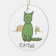 This funny design features a simple drawing of a green, cat-shaped cactus, or "catcus." The catcus appears in the foreground with two regular cacti in the distance in front of two mesas. An ornament for anyone one who appreciates the often prickly nature of cats.