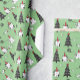 Funny Christmas illustration of cats in Santa hats, with little mice, fish and yarn around Christmas trees. All-over print pattern on a green background.