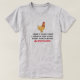 This humorous t-shirt has an image of a chicken with text that says: "I dream of a society where a chicken can cross the road without having its motives questioned.