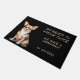 "No need to knock twice, We have a Chihuahua" declares this funny door mat. The text is in pale tan at the right side, while an picture of a adorable Chihuahua dog is at the left. Everything is placed on a black background.