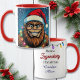 A funny Sasquatch personalized Christmas coffee mug with a comic book style pop art sasquatch smiling with a Santa and Christmas lights on.