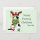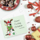 Cute calico cat dressed up in Christmas holiday lights, stuffed antlers, Christmas Santa hat, and a big green bow against a backdrop of light green, The kitty is not happy!