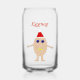 This awesome can glass features a funny cartoon of an egg with arms and legs. The egg has arms and legs and a small crack in its head exposing the white inside. It has blue eyes with a black pupil and a big smile where the yolk of the egg can be seen. The eggshell looks rough. This Christmas egg is wearing a santa hat ready to party this holiday season. There is custom text so you can personalize this design with a name or message. This is the perfect glass for enjoying some eggnog from.