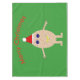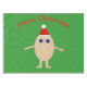 This awesome tablecloth features a funny cartoon of an egg with arms and legs. The egg has arms and legs and a small crack in its head exposing the white inside. It has blue eyes with a black pupil and a big smile where the yolk of the egg can be seen. The eggshell looks rough. This Christmas egg is wearing a santa hat ready to party this holiday season.