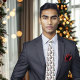A grey cat wearing a red Santa hat. The grey cat is grumpy about Christmas