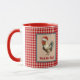This funny rooster wants to cheer you up for your morning coffee during the holidays or any day, especially if you're feeling peckish. He's wearing a Santa hat and encouraging you to "Peck the Halls" - but you can edit the text if you want as long it's short. The rooster has an antique look, with dusty teal blue feathers, and is set against a tan and white faux dotted Swiss and framed in teal. The mug background is a cheery gingham-like farmhouse chic plaid. Be forwarned that Santa might be chicken his list twice :-).