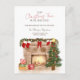Our Christmas tree has moved, send your new address to friends and family with this cozy winter fireplace with hand painted traditional cozy winter Christmas scene featuring a stone chimney, burning fire place, christmas pine wreath and socks, with a cute green and red Christmas tree and glowing light and stack of wrapped gifts and presents Perfect winter and holidays moving announcement.