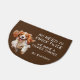 "No need to knock twice, We have a Cocker Spaniel" declares this funny door mat. The text is in white at the right side, while an image of an adorable red and white Cocker is at the left. Everything is placed on a dark brown background.